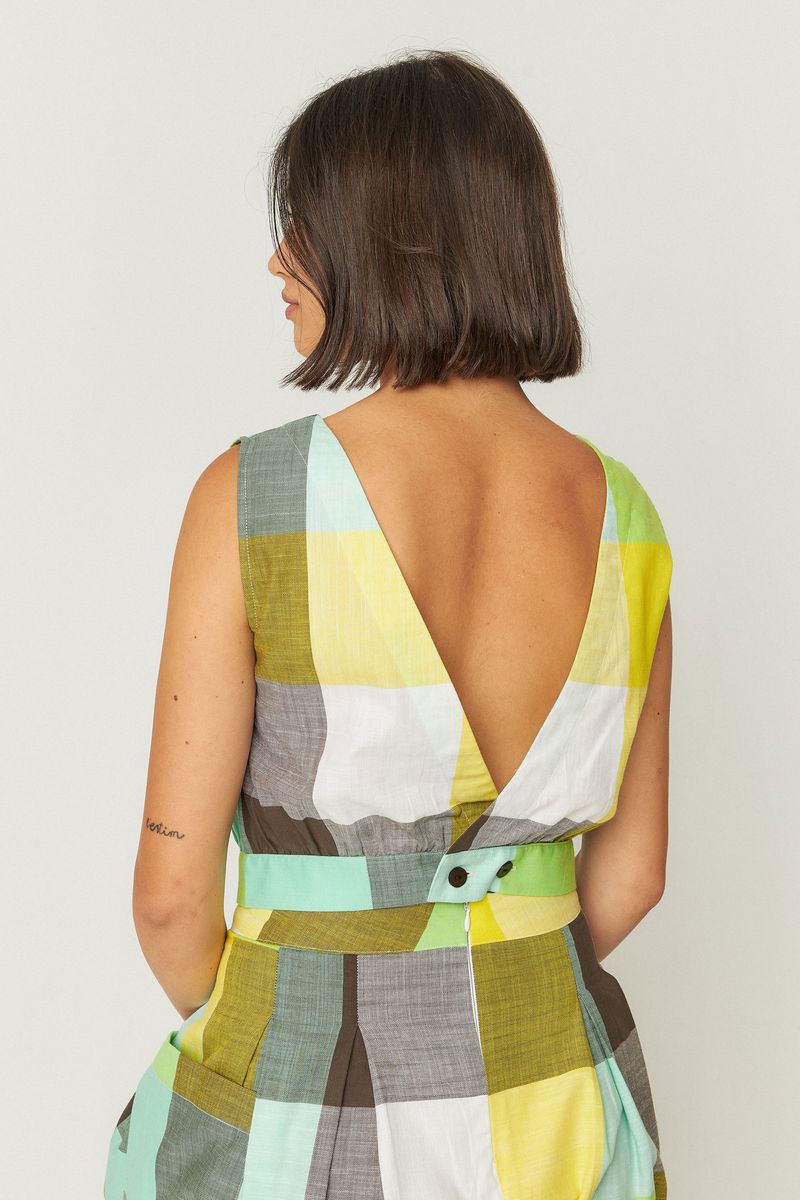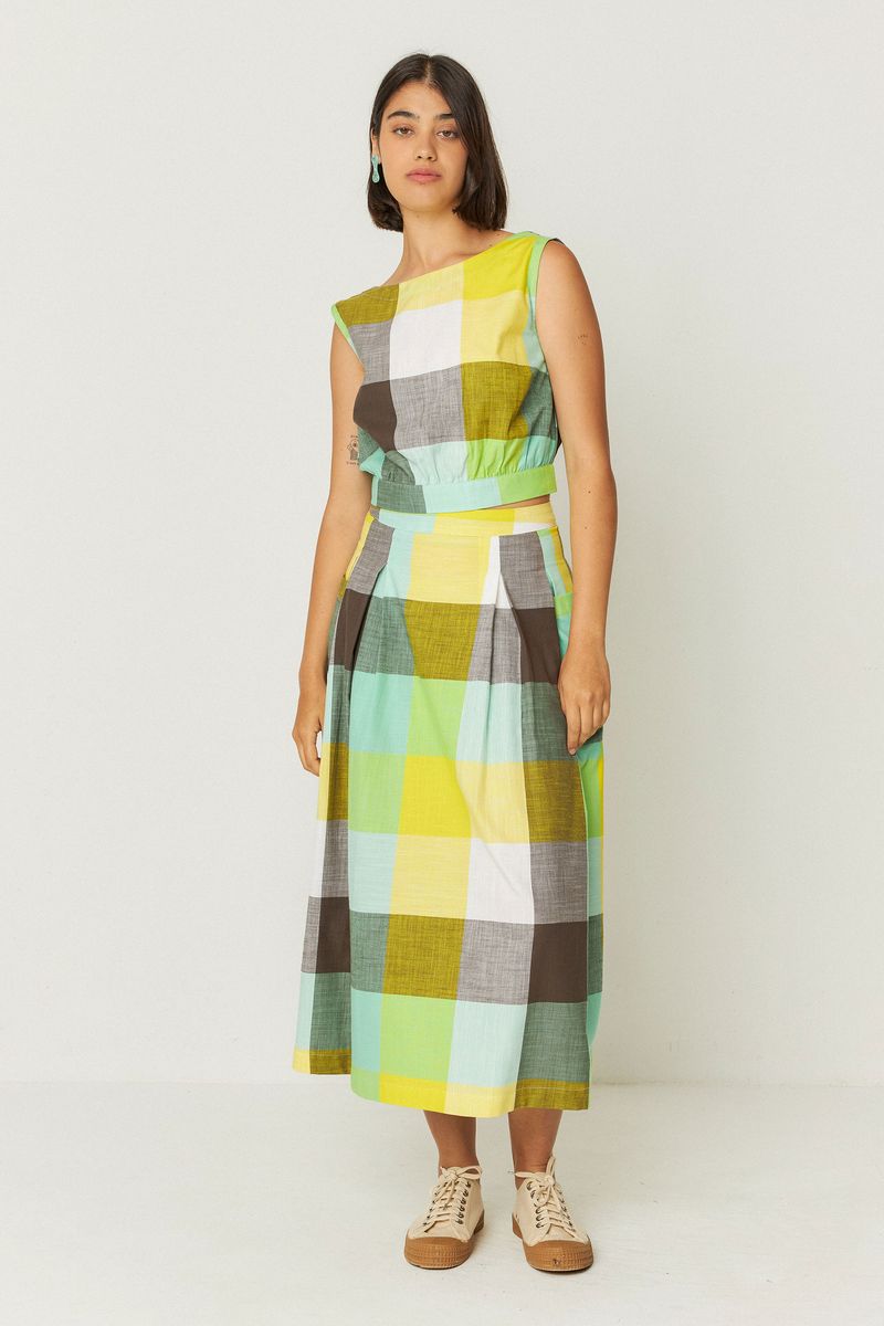 This fitted, sleeveless cropped top with a round neckline offers a stylish silhouette. Featuring a convenient button fastening at the back and a timeless checkered pattern, it’s made from 100% organic cotton for comfort and sustainability. Elevate your wardrobe with this versatile piece.
